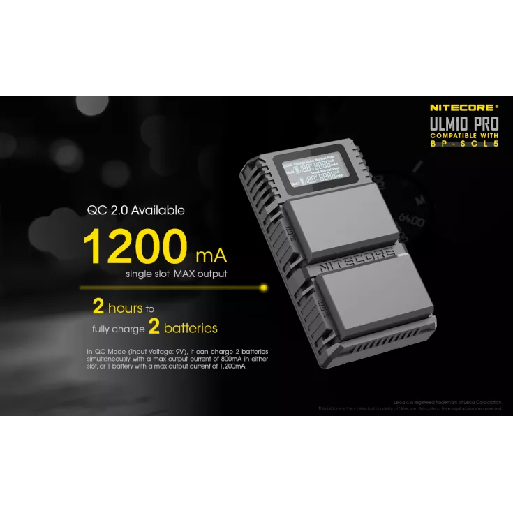 The ULM10 Pro has a dual slot design to allow for up to two BP-SCL5 batteries to be charged simultaneously. The charger has a high definition LCD display screen with real-time charging information on the battery health, charged volume, battery temperature, charging current and battery voltage. The ULM10 Pro features reverse polarity and anti-short circuit protection to keep your batteries in the best health.