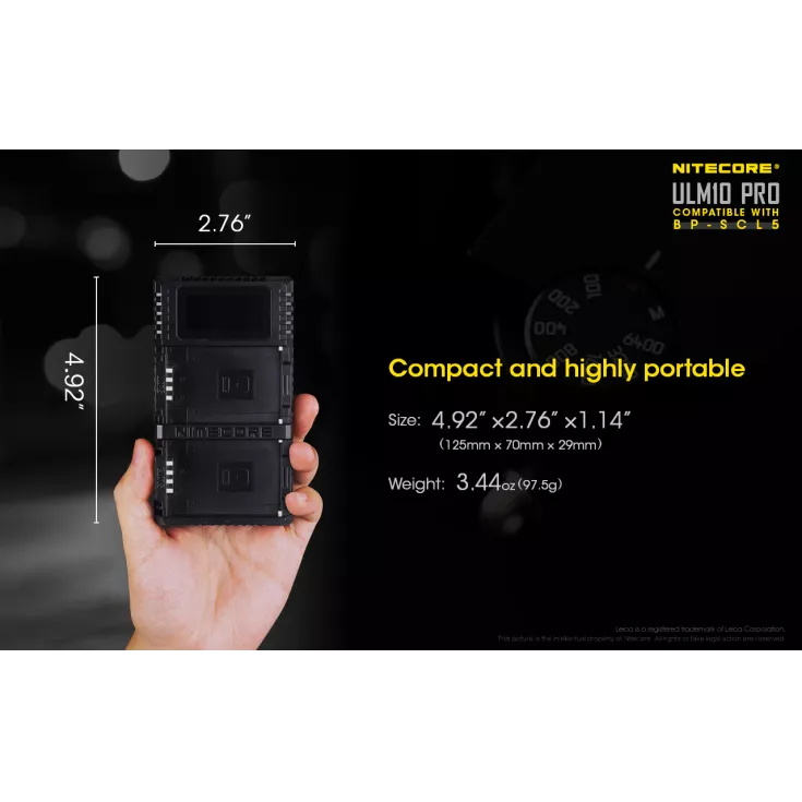 The Nitecore ULM10 Pro charger is compatible with the Leica BP-SCL5 battery, which powers the Leica M10 camera. Ideal for keeping your gear light and portable, the charger uses a USB cable which allows for a variety of power sources, including a USB adapter, power bank or solar panel device.