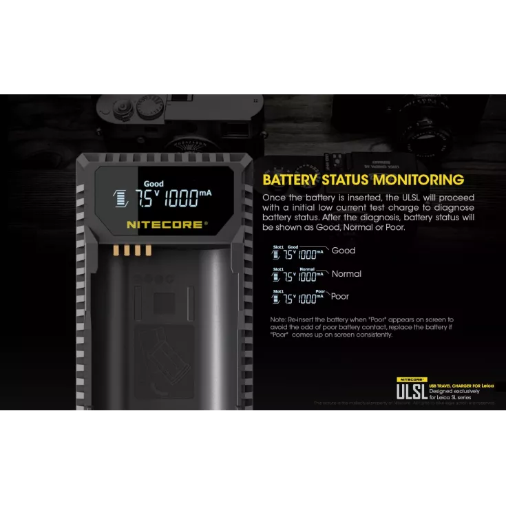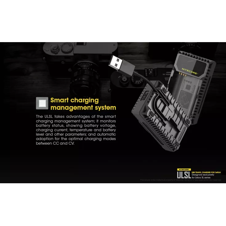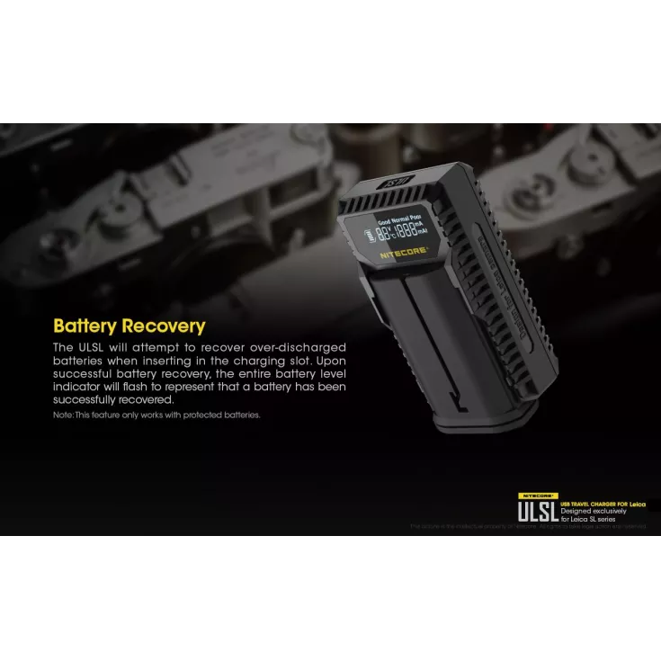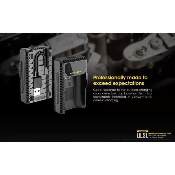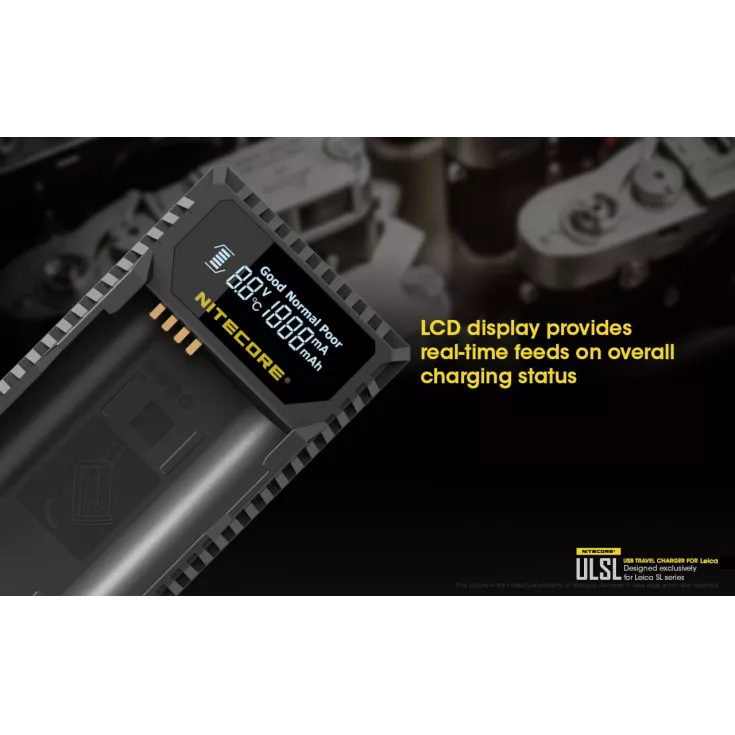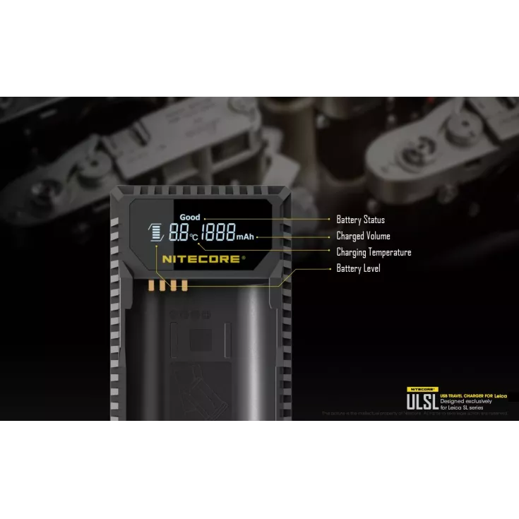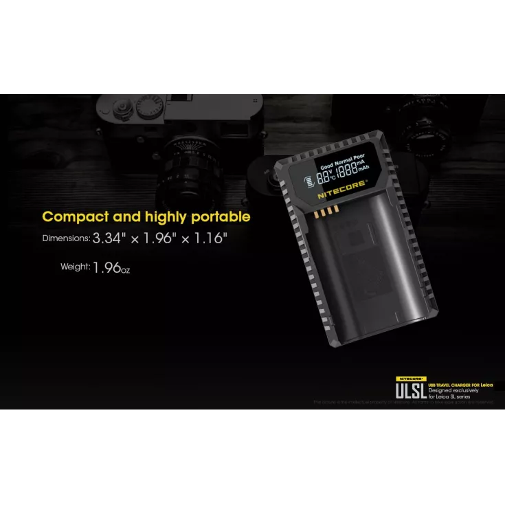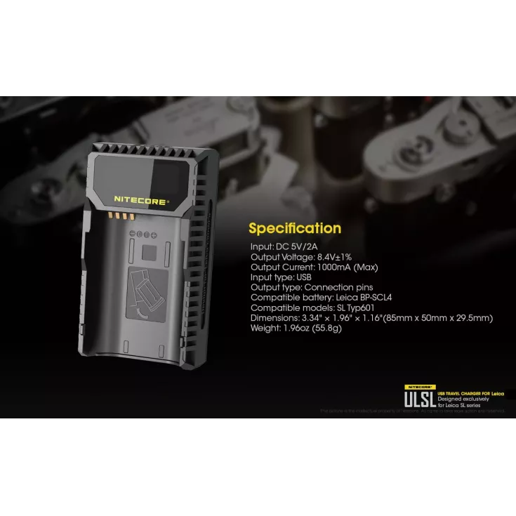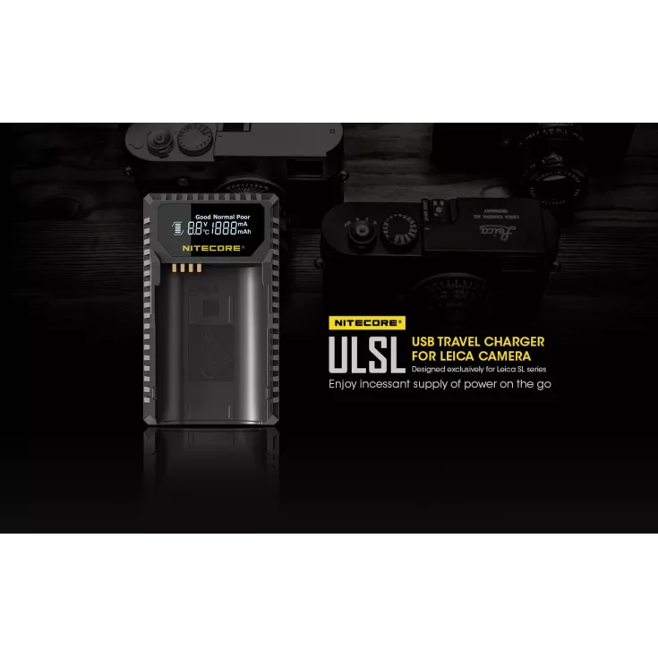 The Nitecore ULSL is a USB charger for Leica camera batteries in the SL series and is specifically compatible with the Lieca BP-SCL4.