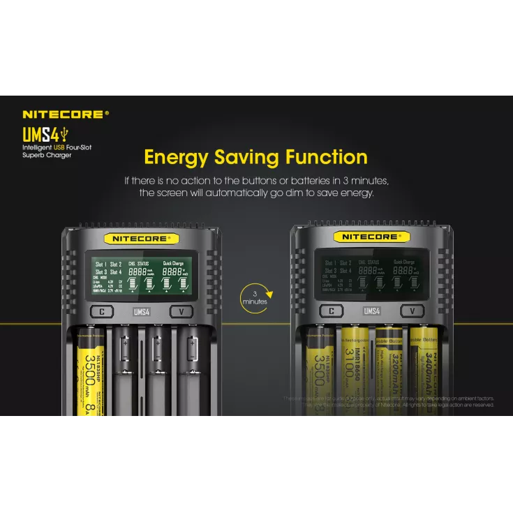 With safety and convenience at the forefront of this design, the Nitecore UMS4 features anti-short circuiting, reverse polarity protection and an energy saving function when there has been no action in 3 minutes.