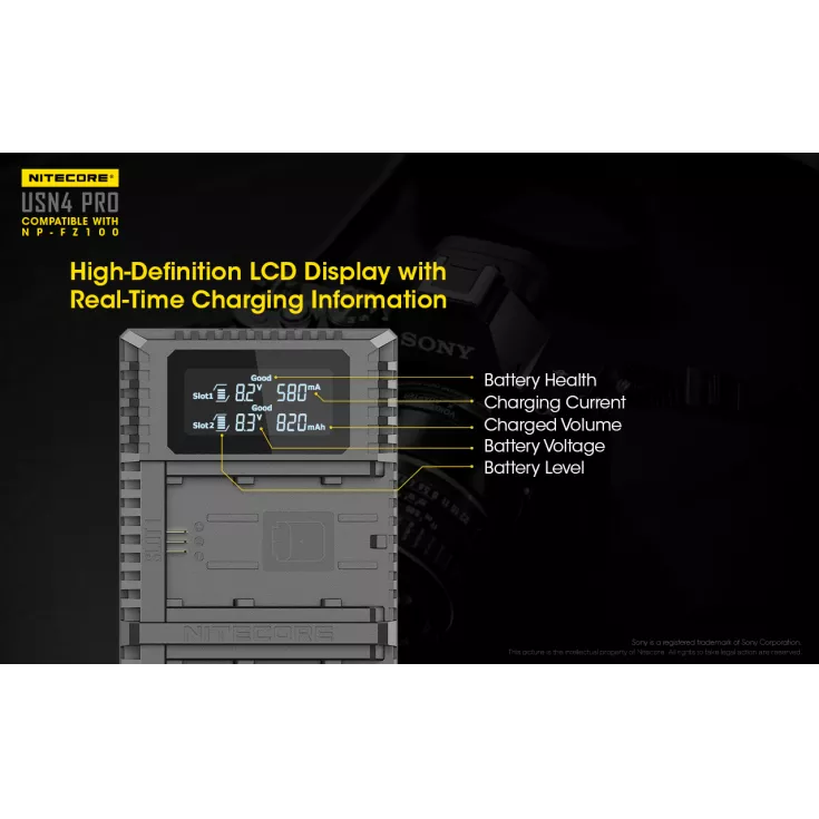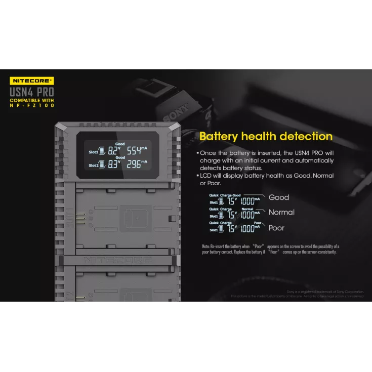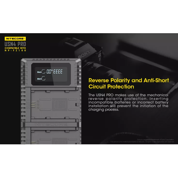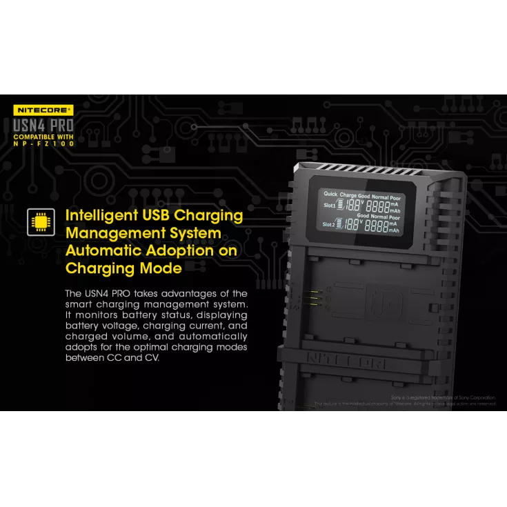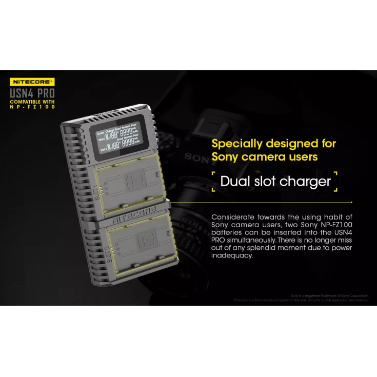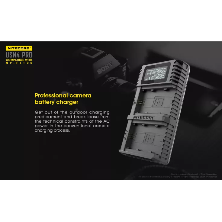 The Nitecore USN4 Pro is a dual slot USB charger, designed for the Sony NP-FZ100 camera battery and ideal for travel. Providing an alternative to a conventional camera charger, the USN4 Pro makes your gear lighter and allows for convenient charging on the go.
