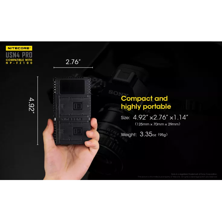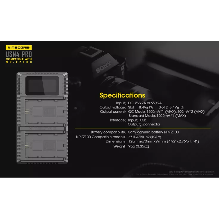 The Nitecore USN4 Pro is compatible with the Sony NP-FZ100 which can be used with the following Sony cameras: a7 III, a7R III, a9 (ILCE-9).