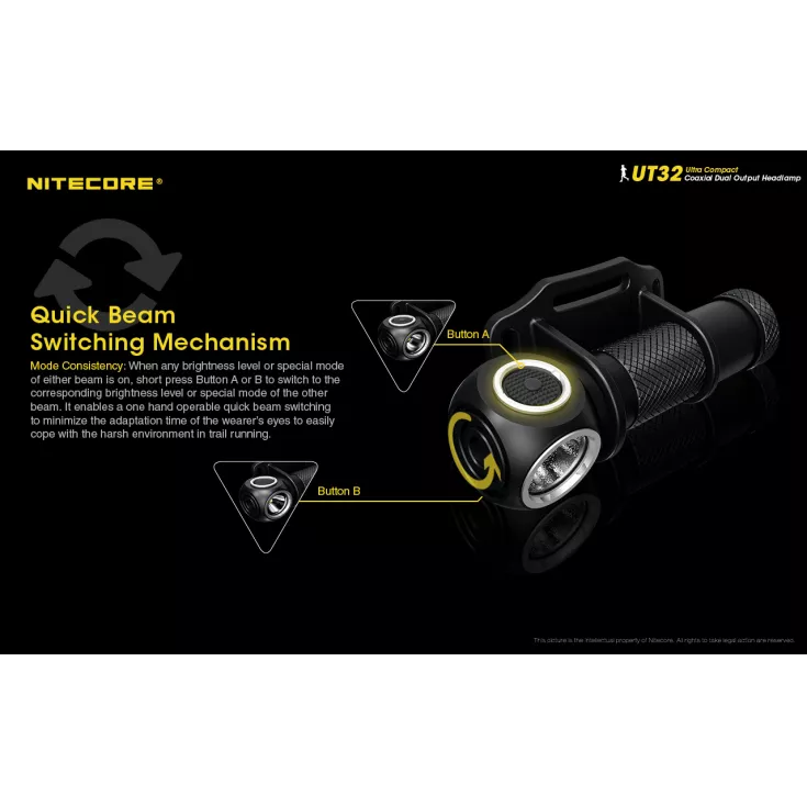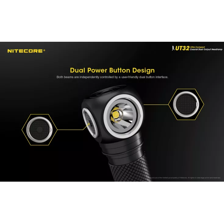 The UT32 is powered by a single 18650 Li-ion rechargeable battery (not included) and is operated via dual power buttons. Each beam is controlled by its own switch with quick beam switching mechanism.
