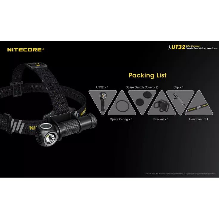 Nitecore UT32 Includes: Light weight headband, removable pocket clip and spare o-ring.