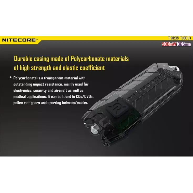 The new UV version of the popular Nitecore Tube features a 365nm wavelength ultraviolet LED. With 500mW in power, the UV Tube has an ultra light design making it easy to carry and ideal for identifying fake money and identity card. The Tube can also be used for verification mark reading and fluorescence activation.
