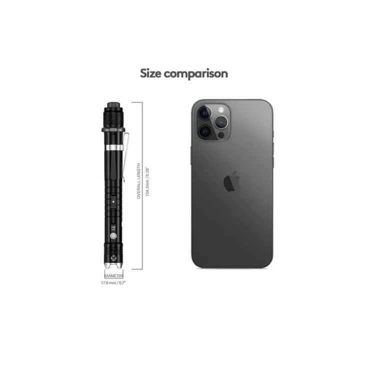 The RovyVon H3 Pro penlight has a maximum output of 600 lumens from the CREE XP-L HI LED. The slim torch offers a hybrid power supply with a rechargeable, built-in 330mAh Lipo battery and a replacement AA or 14500 battery (not included).